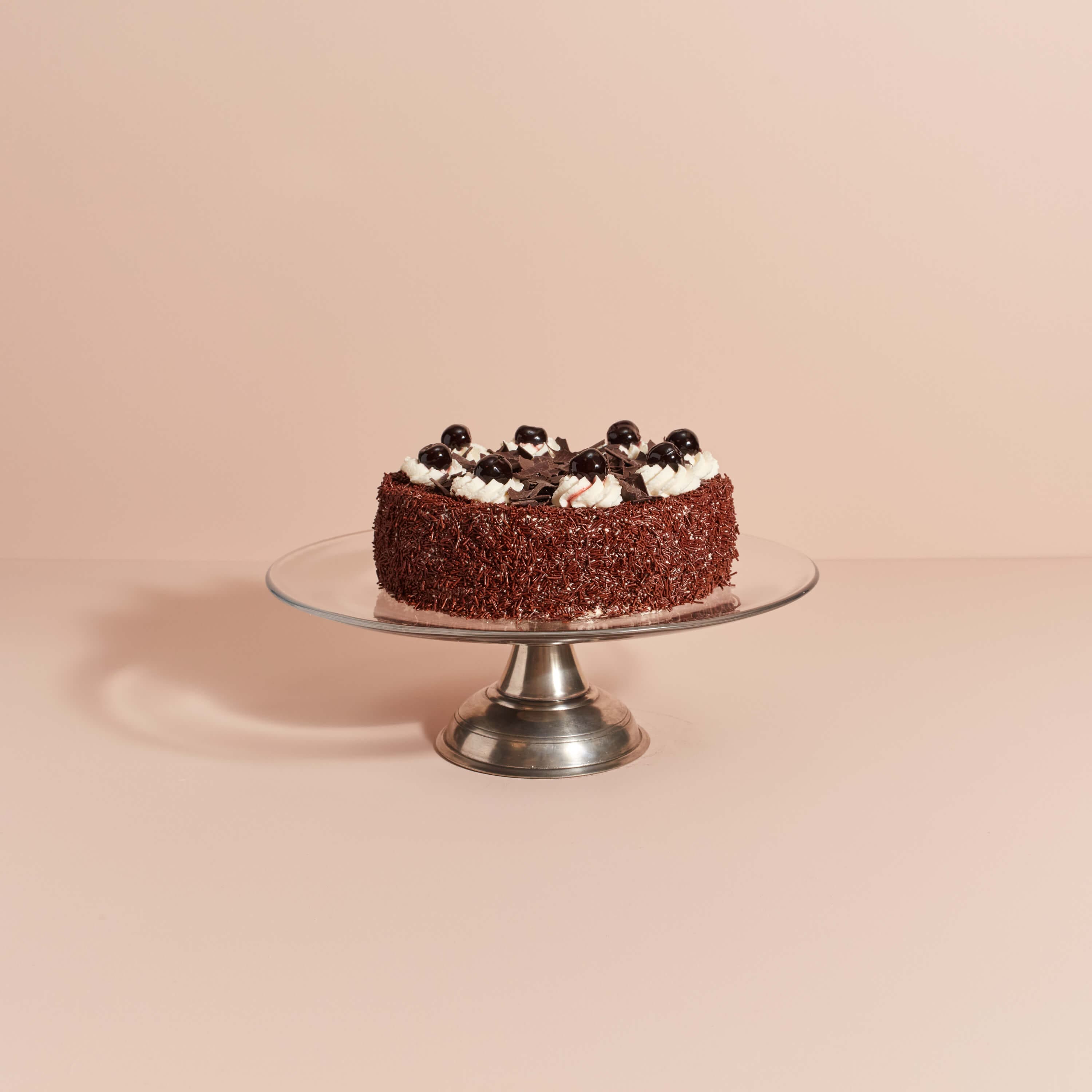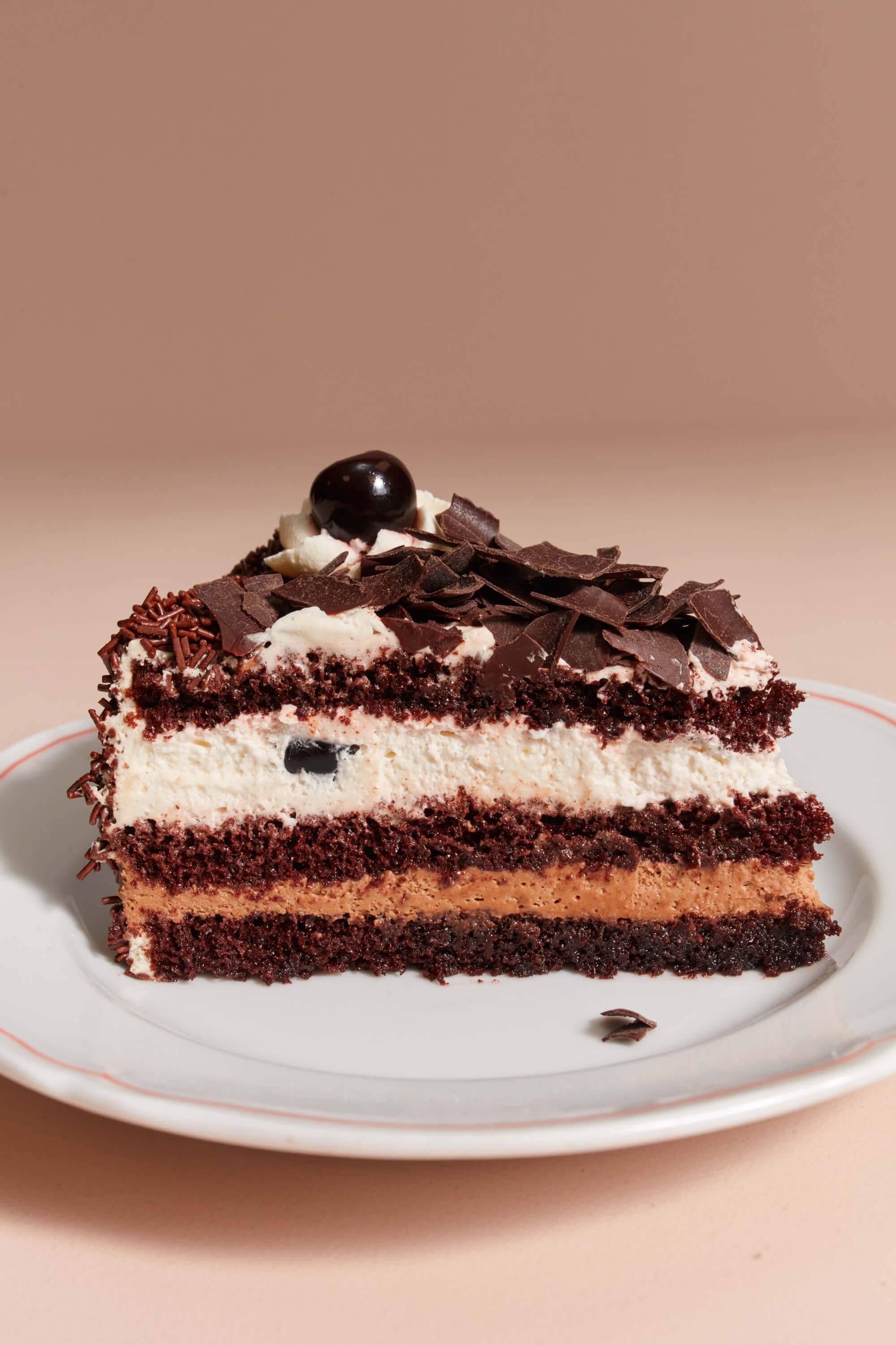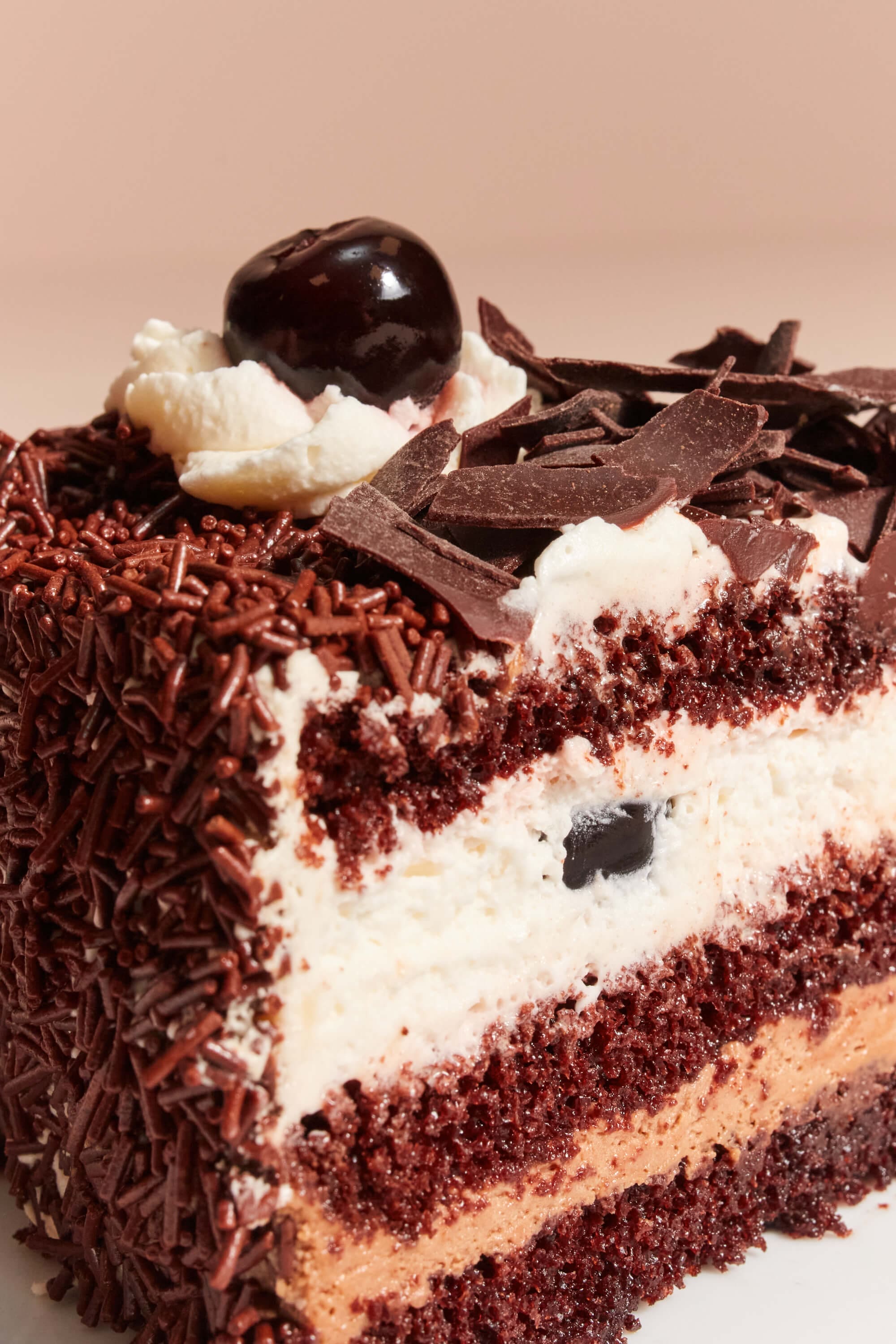 Black Forest is a refined layered chocolate cake infused with rum syrup, featuring rich dark chocolate mousse, delicate white cream, and tart amarena cherries. It is elegantly finished with Chantilly cream and dark chocolate vermicelli, offering a luxurious dessert experience.
