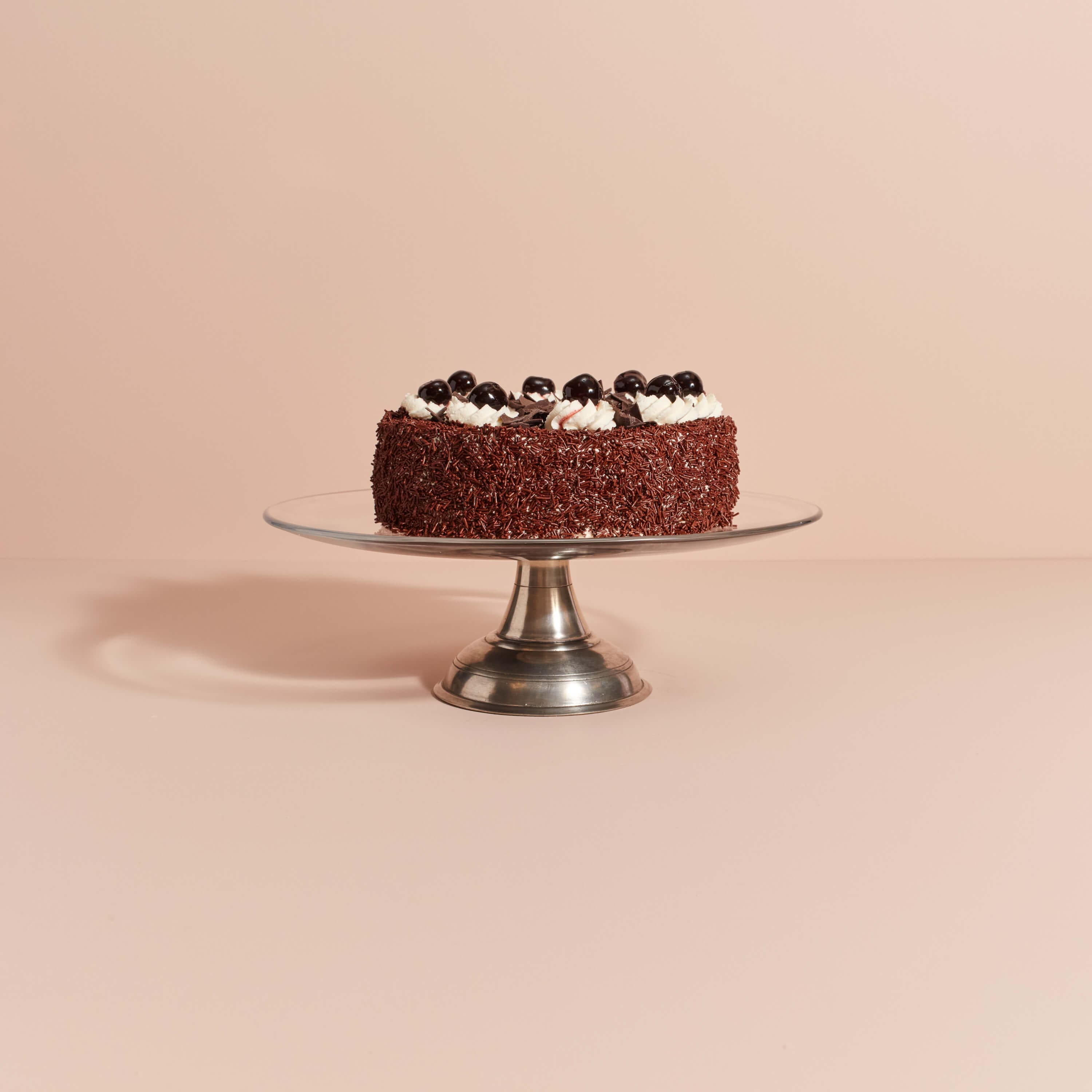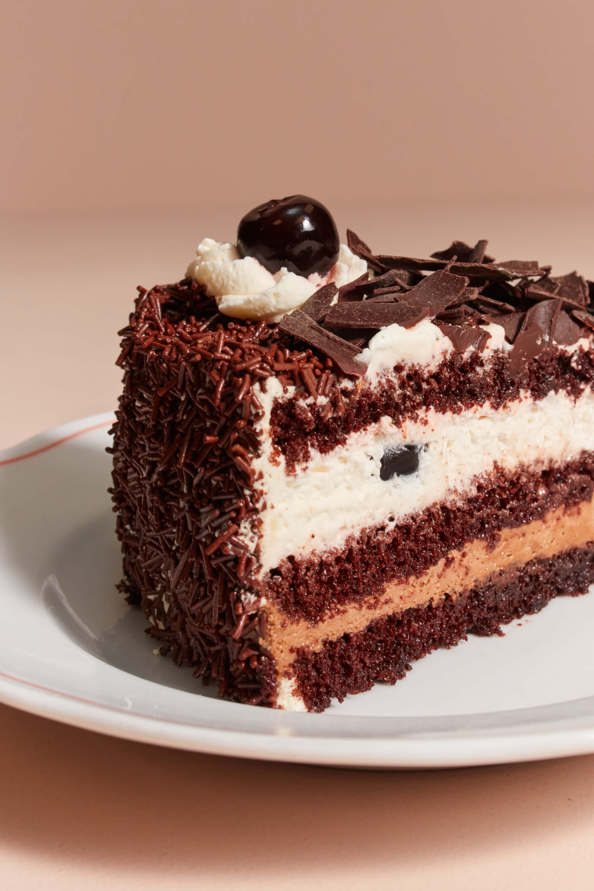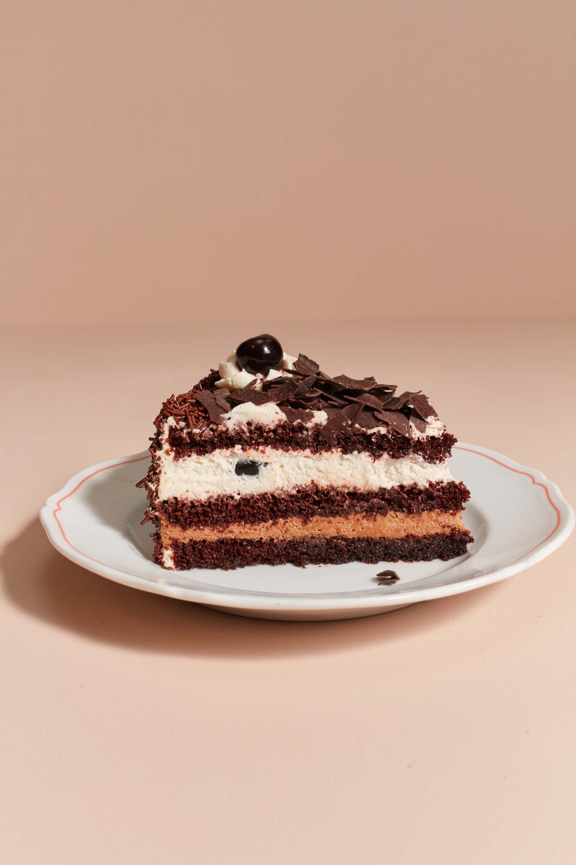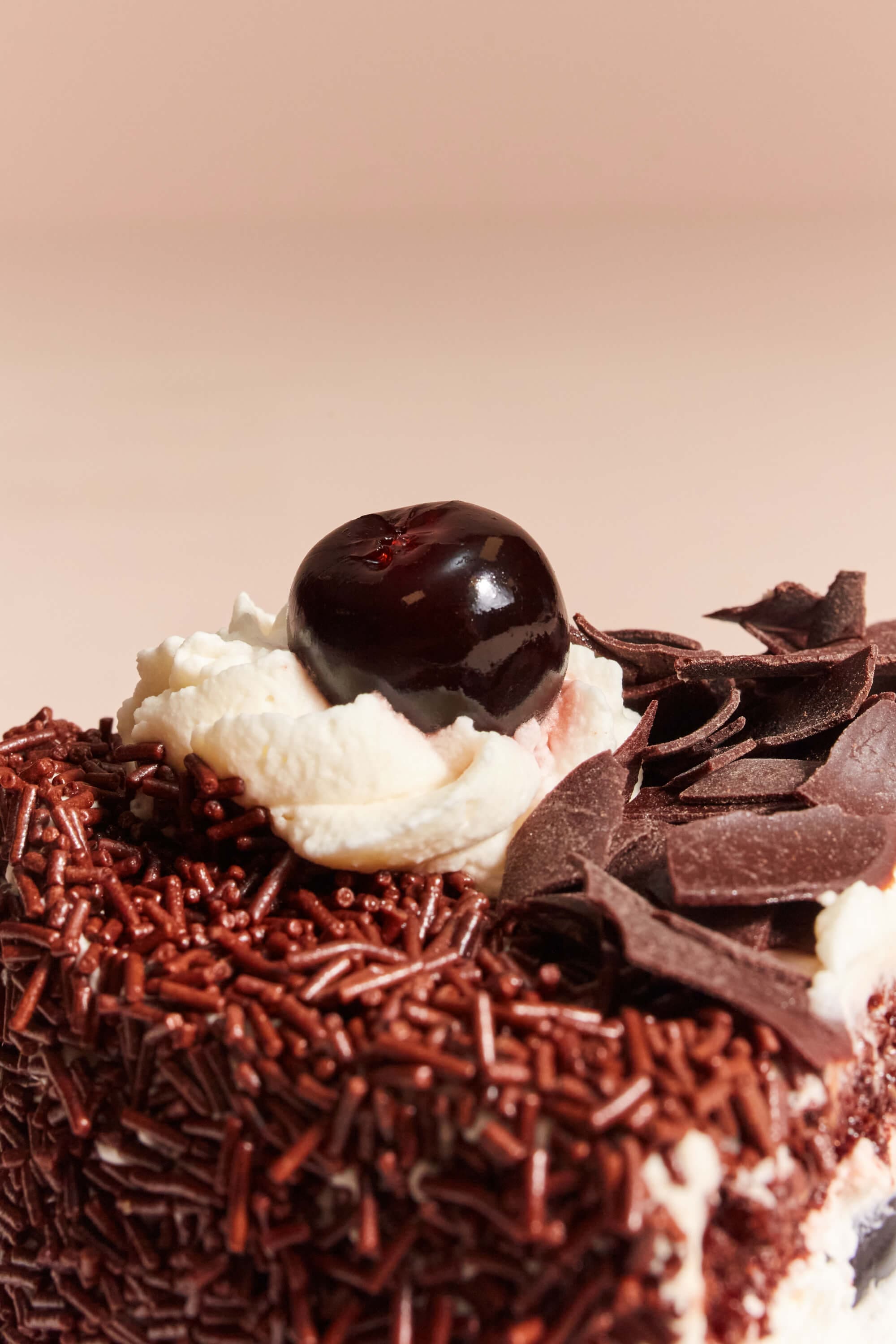 Black Forest is a refined layered chocolate cake infused with rum syrup, featuring rich dark chocolate mousse, delicate white cream, and tart amarena cherries. It is elegantly finished with Chantilly cream and dark chocolate vermicelli, offering a luxurious dessert experience.