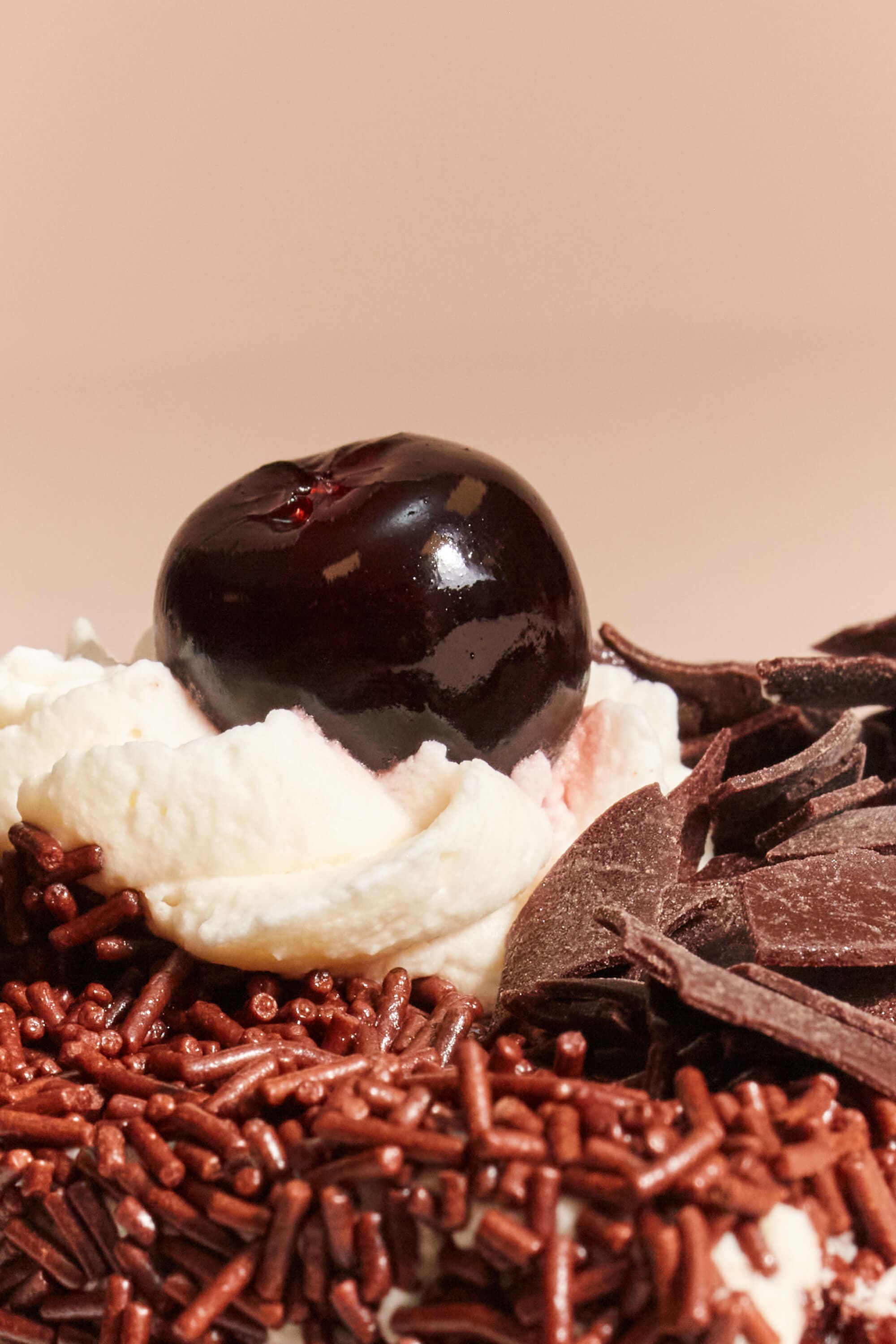 cocoa powder, fluid flex, vanilla extract, cornstarch, baking soda, baking powder, cake flour,  eggs, milk , heavy cream, granulated sugar, water, eggs, yolks, chocolate 70%, vermicelli dark, powder sugar, amarena cherries.