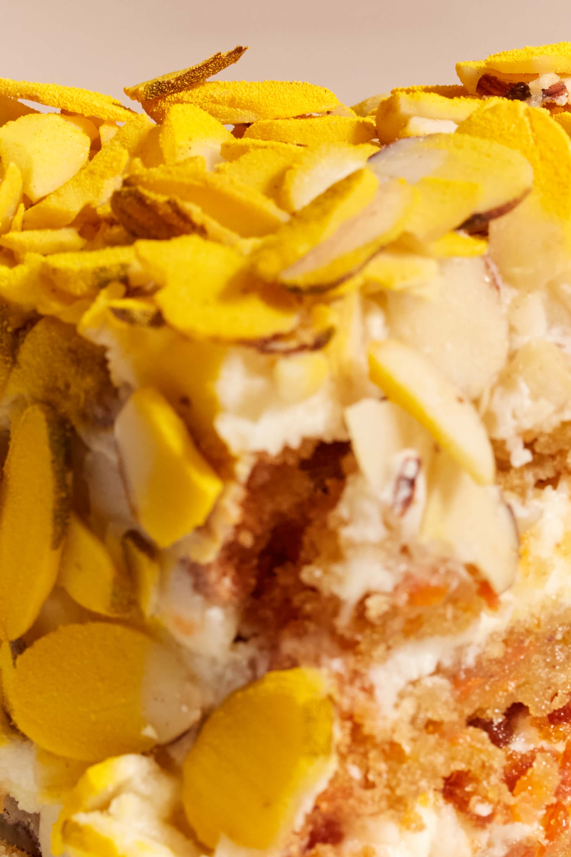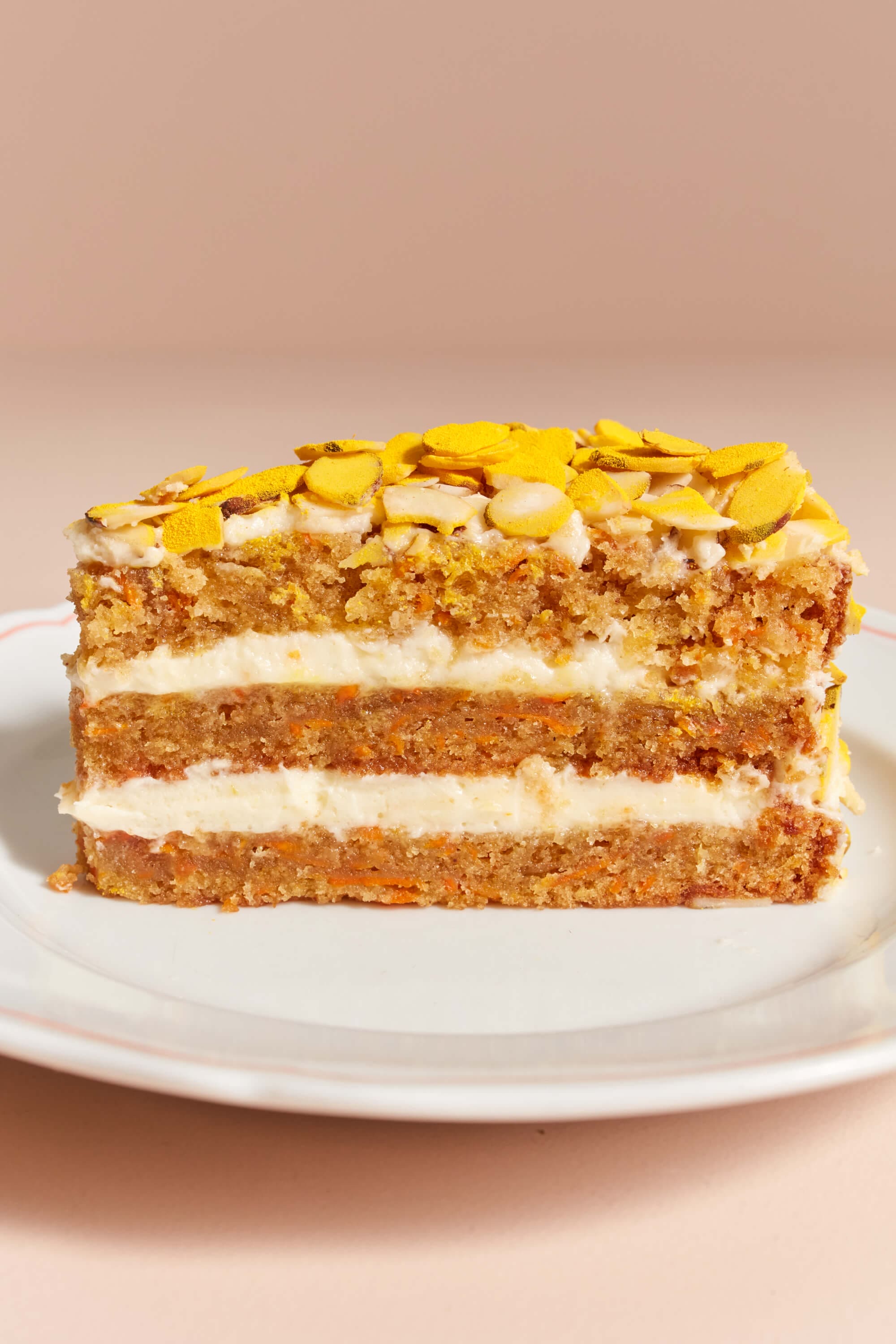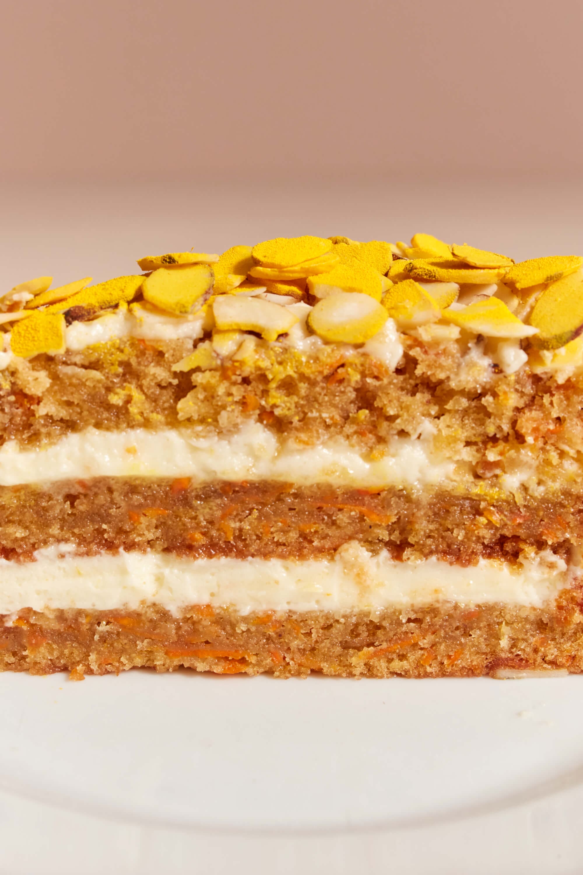 This carrot cake features velvety, spiced layers generously filled with smooth cream cheese frosting, offering a refined and delightful dessert experience.