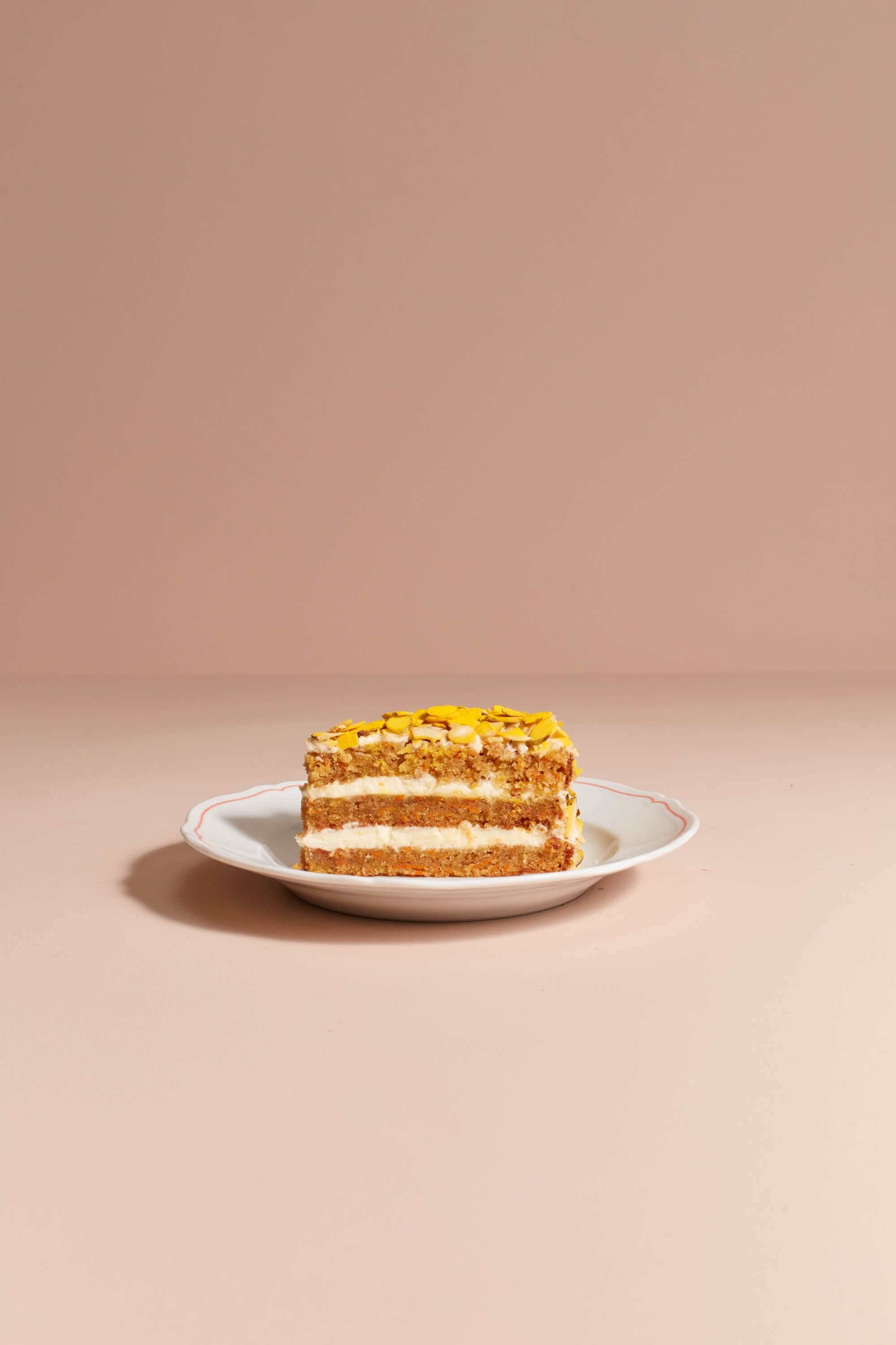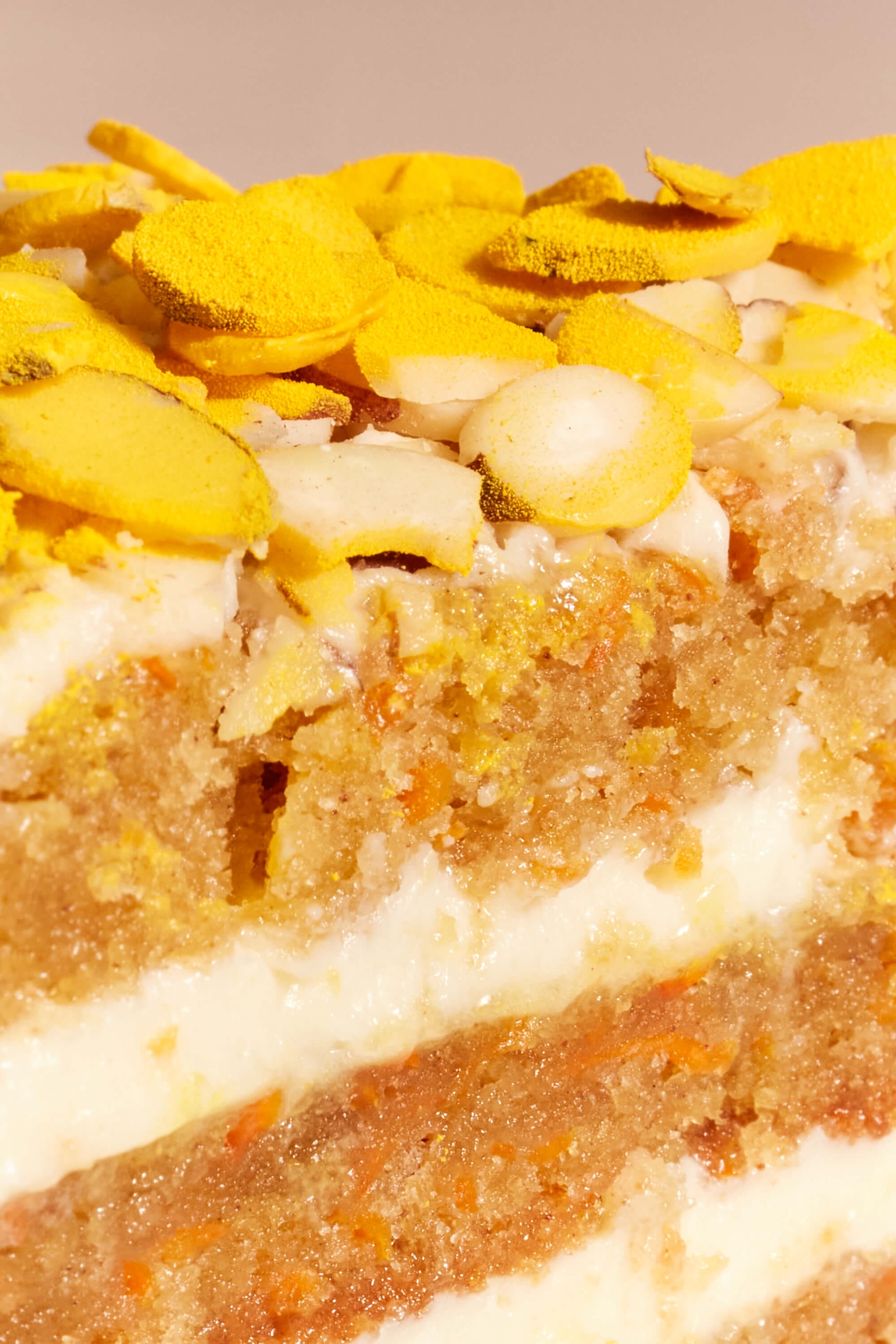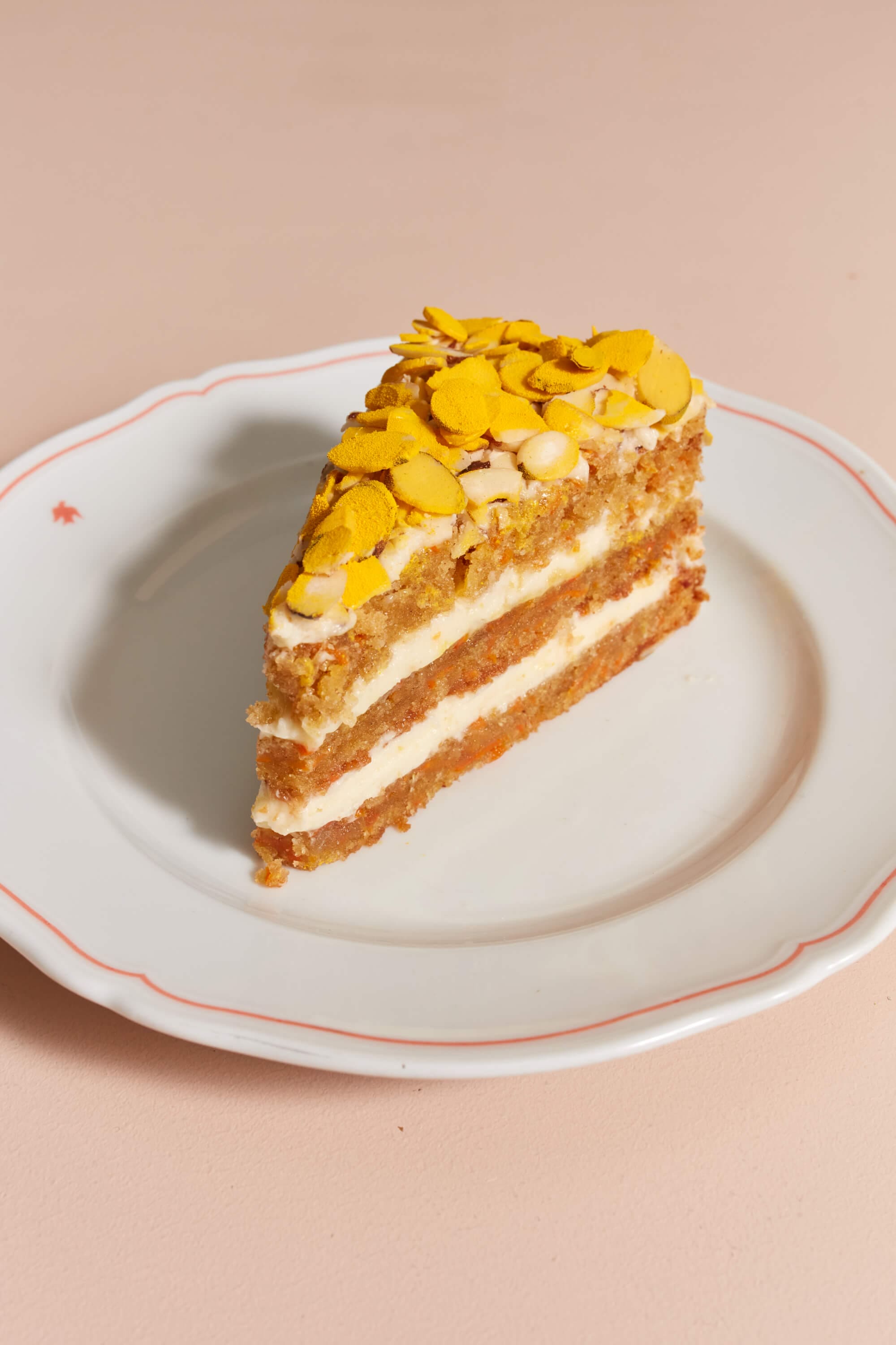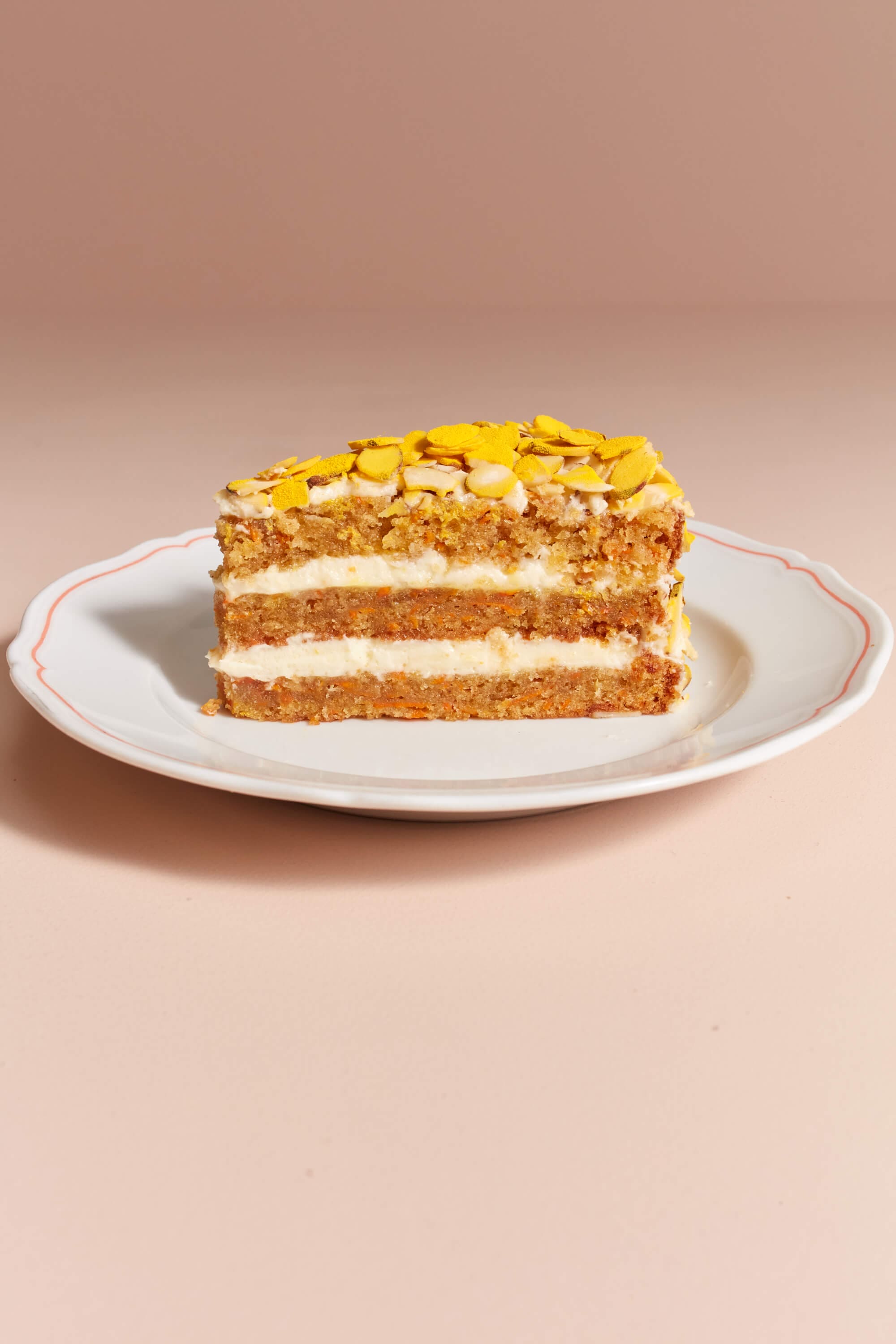 This carrot cake features velvety, spiced layers generously filled with smooth cream cheese frosting, offering a refined and delightful dessert experience.