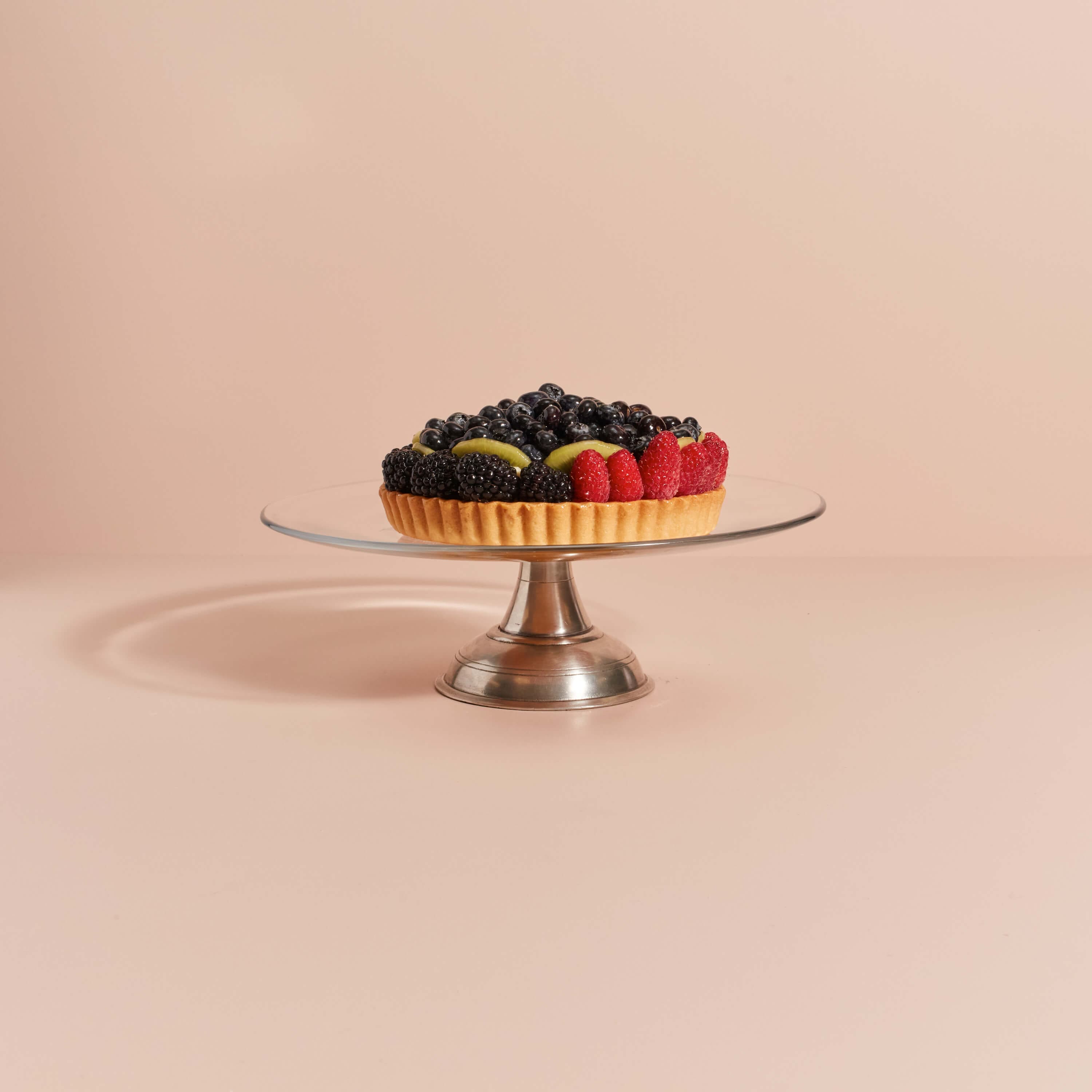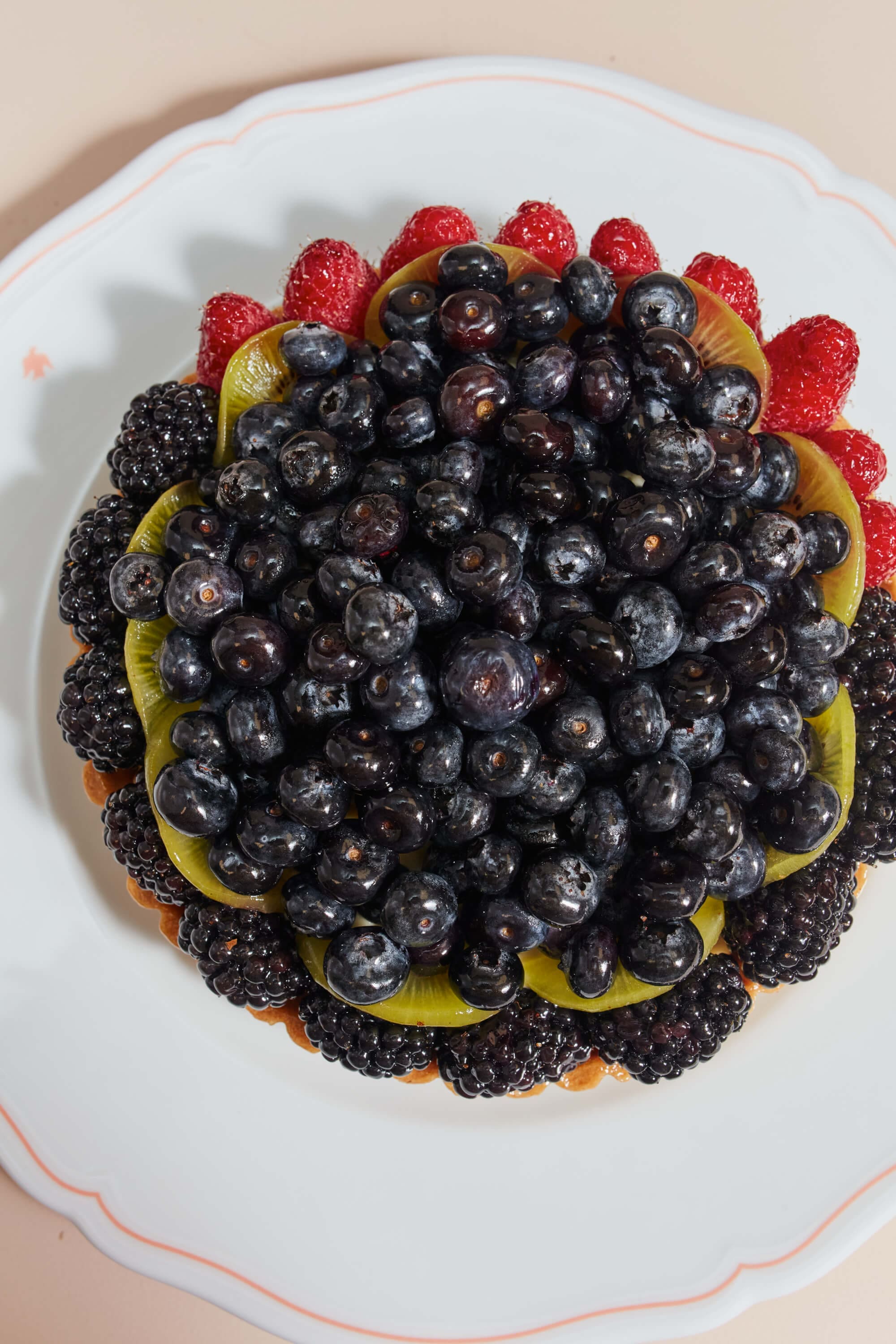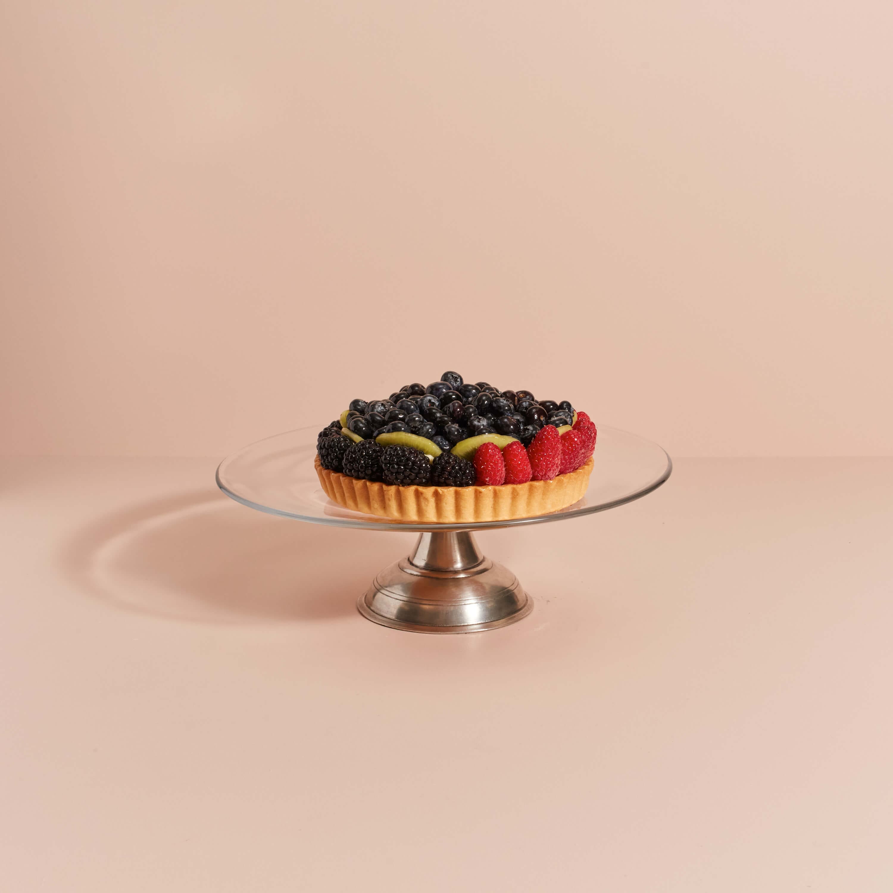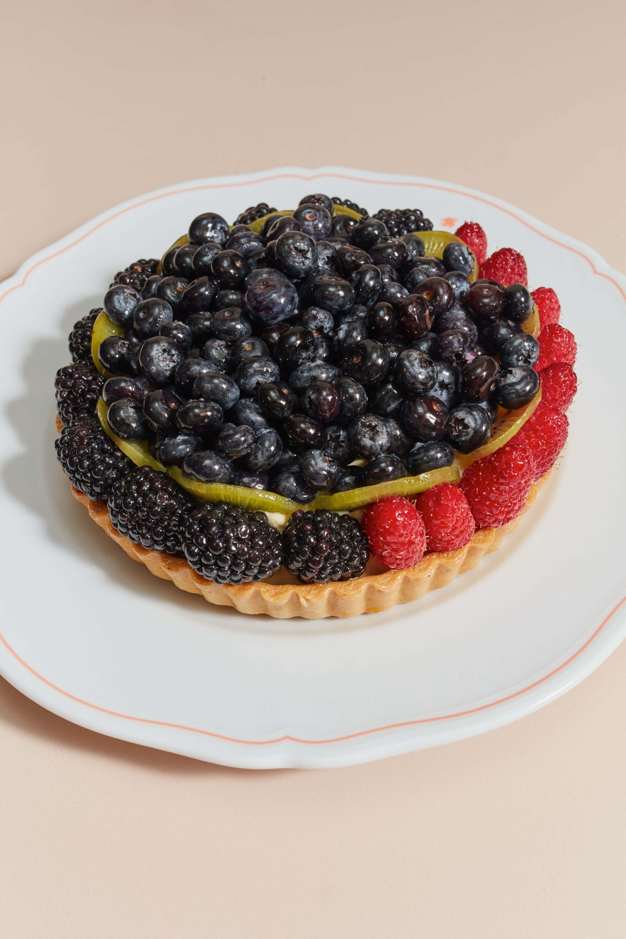 Sugar dough almond cookie base filled with vanilla Bavarian cream and garnished with mixed fruit berries.