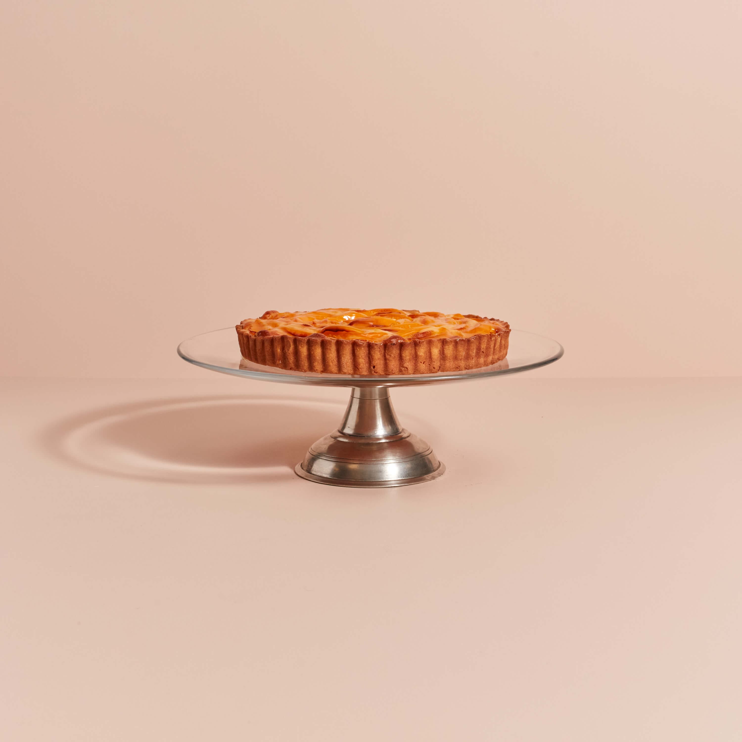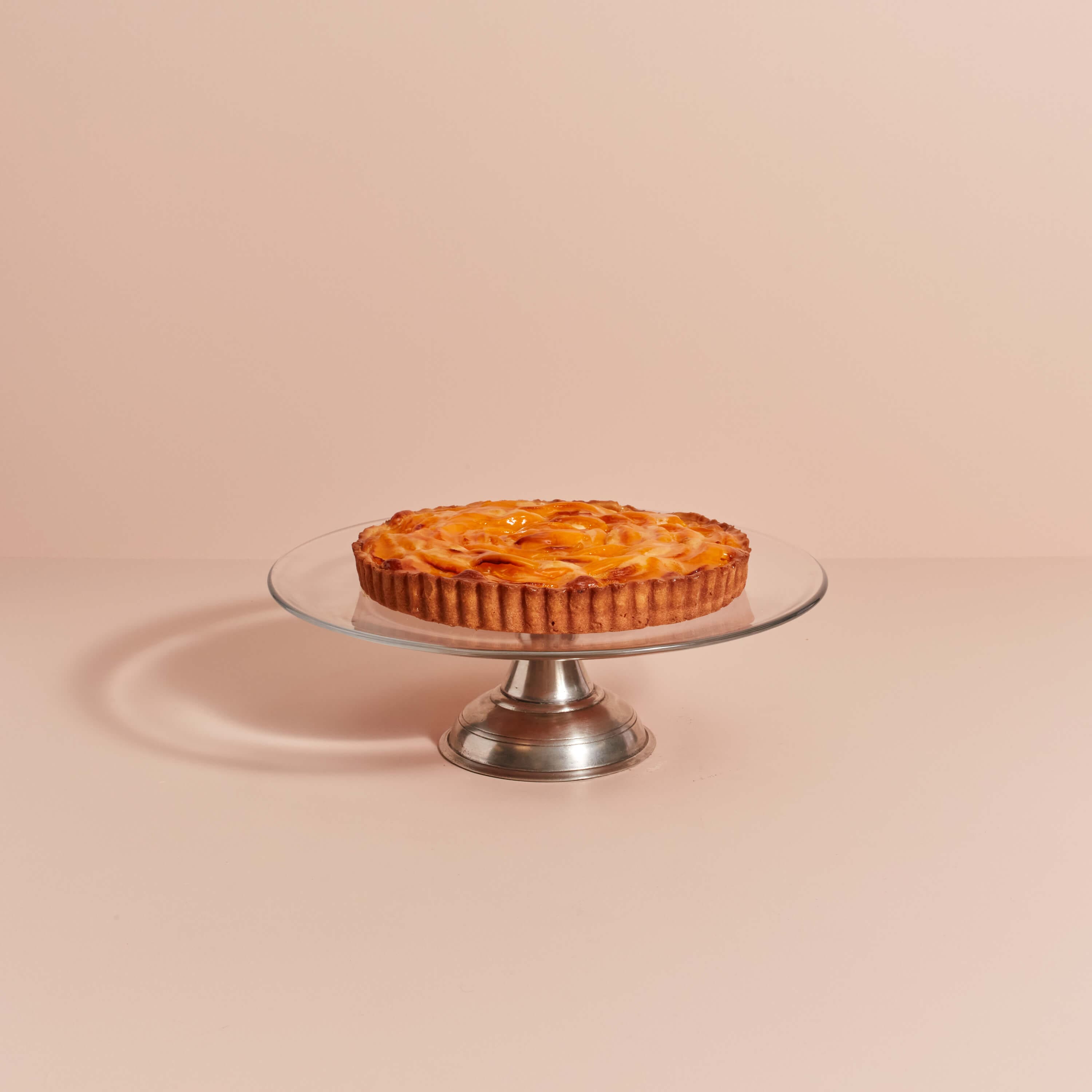 Peach tart features a delicate sugar crust layered with rich almond cream and topped with fresh, seasonal peaches. A glossy apricot glaze enhances the fruit, while roasted almonds add a subtle crunch and depth of flavor.