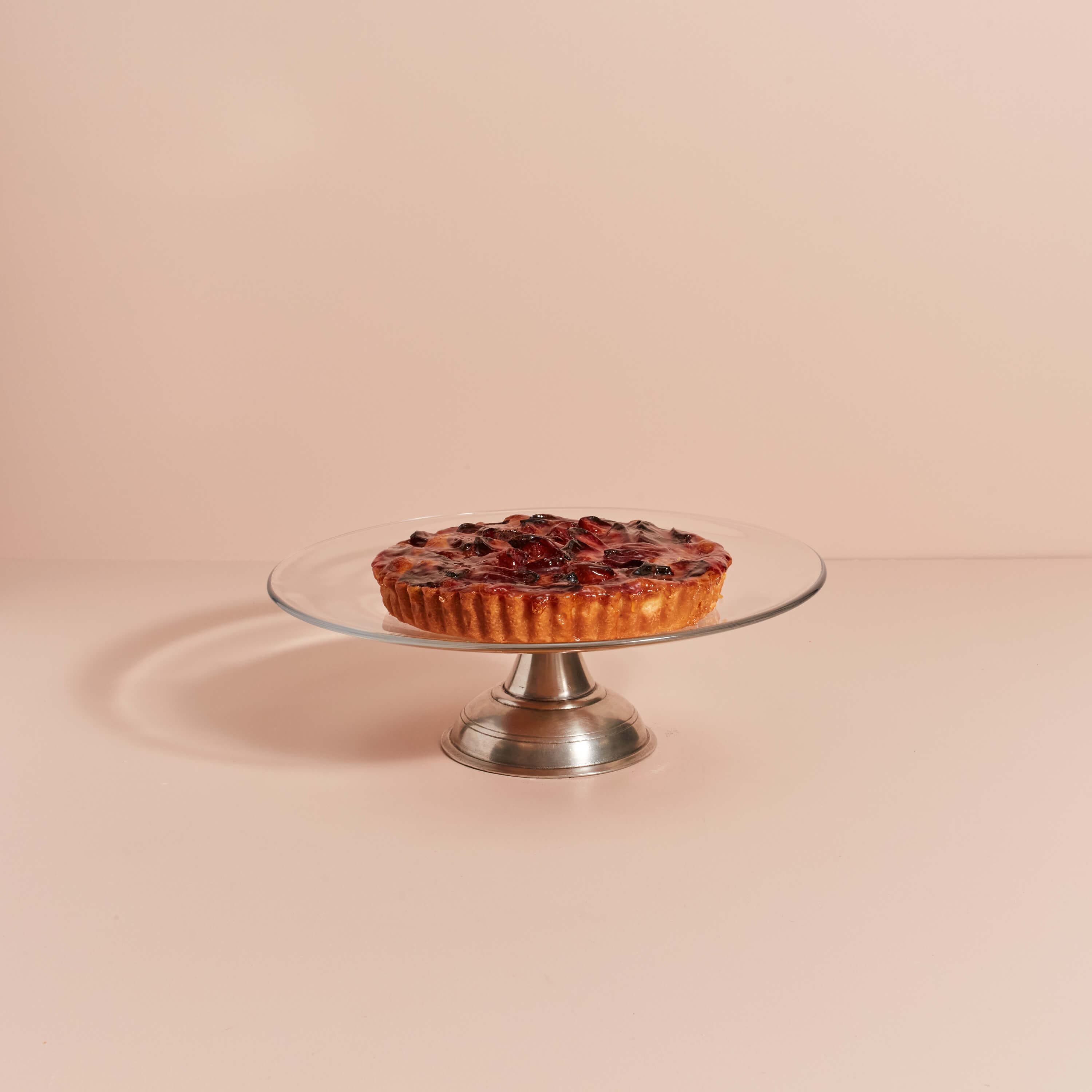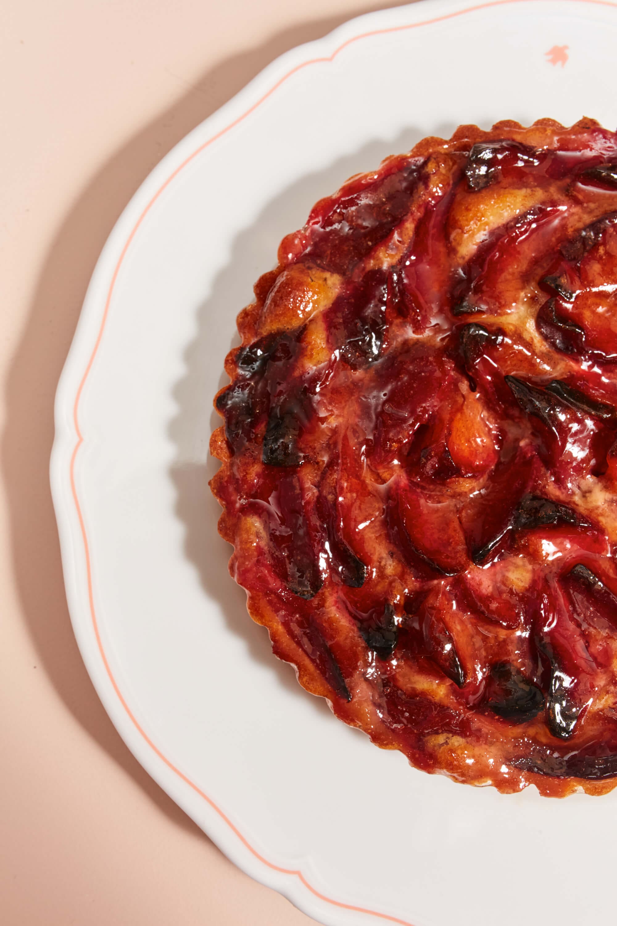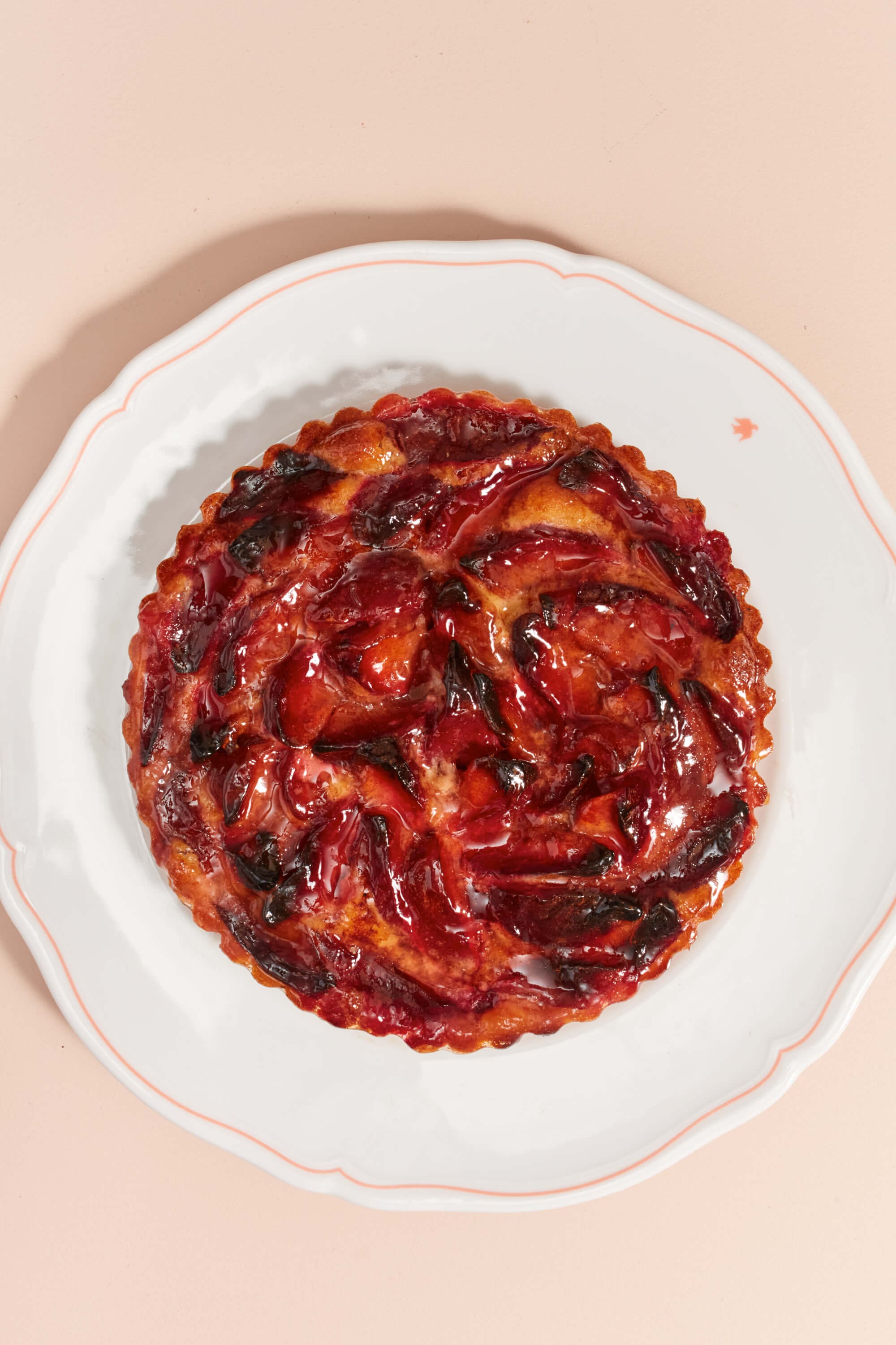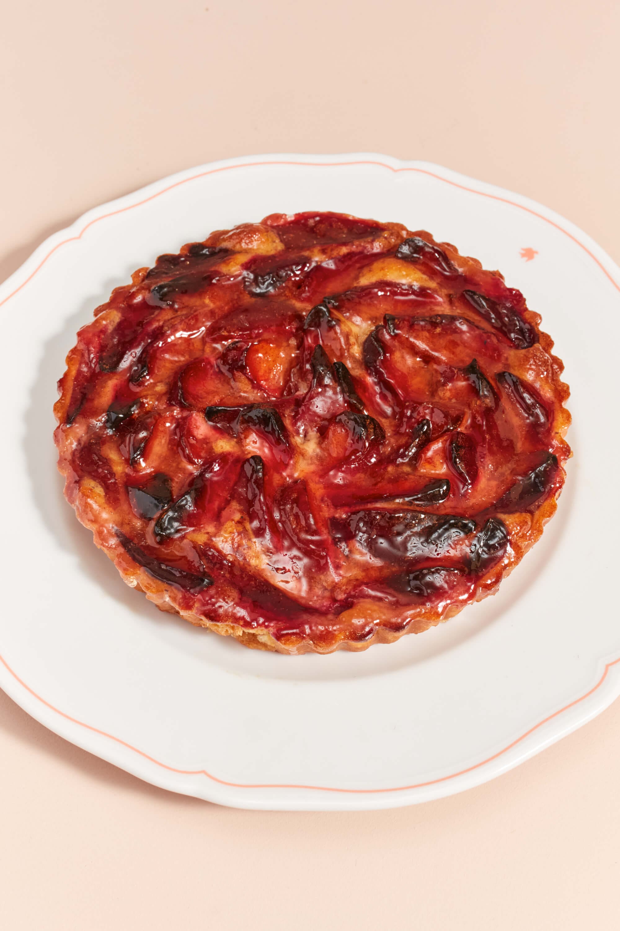 Fresh plums are beautifully arranged on almond cream filling with a sugar dough base.