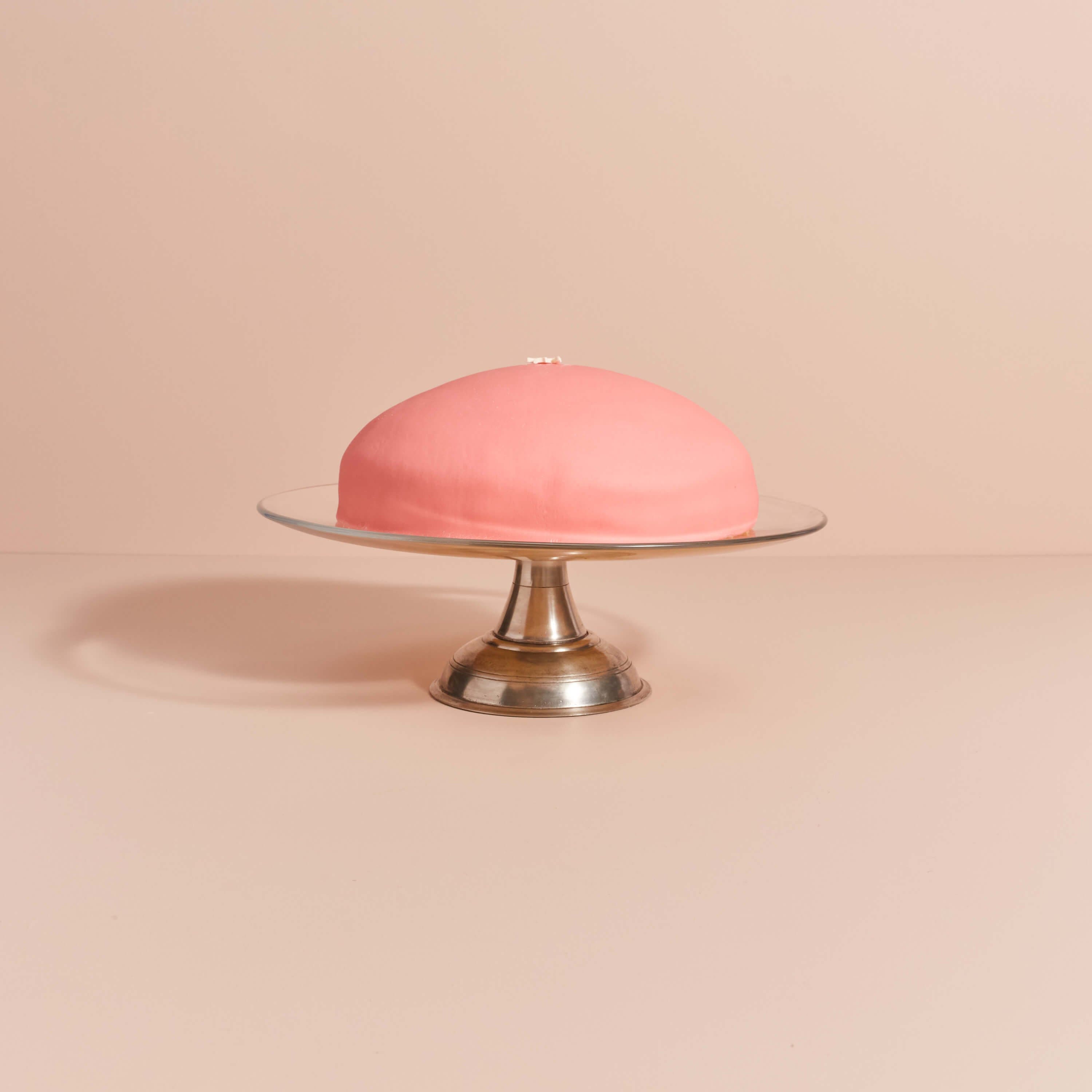 A bright lemon sponge cake layered between rich vanilla pastry cream and whipped cream, topped with pink almond marzipan.