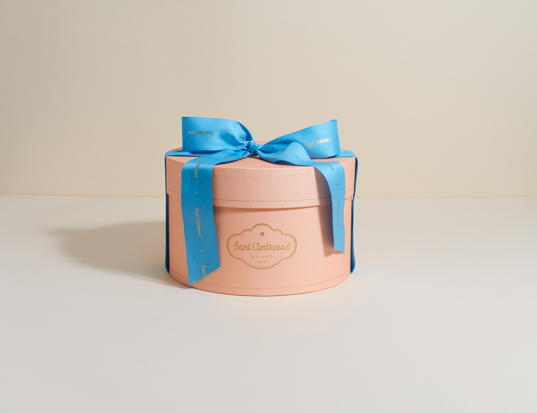 A beautiful hat box designed in our signature pink with scalloped edge detail, gold foil logo, and unexpected sky-blue interior. Finally, it is filled with a panettone and tied with a sumptuous woven ribbon with gold logo detail, making it the perfect gift or elegant keepsake.