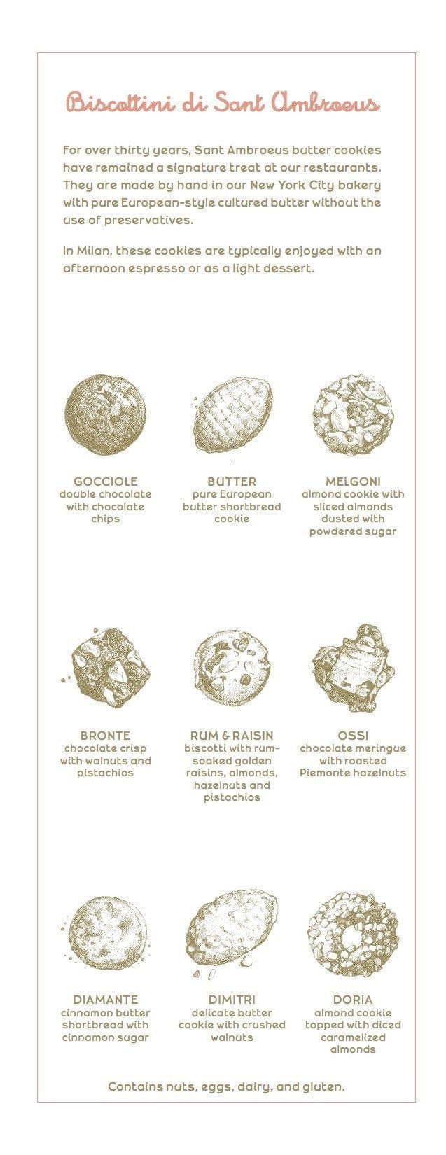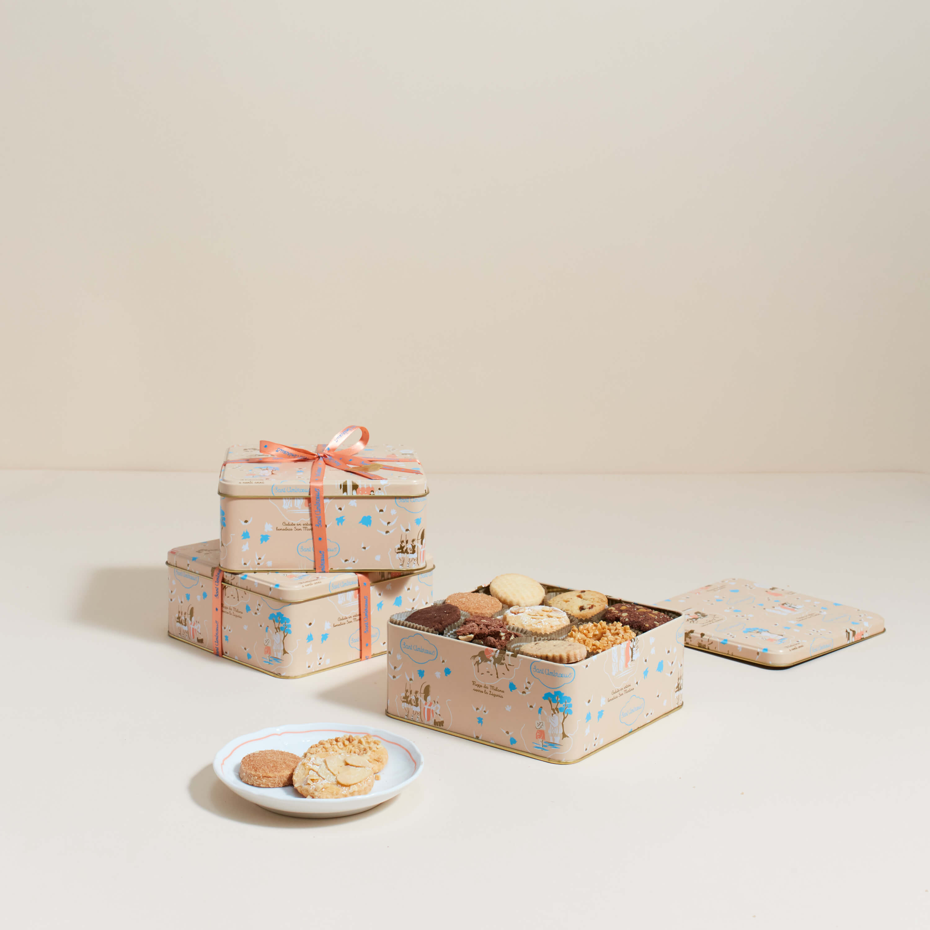 Da oltre ottanta anni, i “Biscottini Sant Ambroeus” rappresentano un dolce simbolo dei nostri ristoranti. Fatti a mano nel nostro laboratorio, vengono prodotti con l’uso di soli ingredienti della tradizione italiana e senza conservanti. I biscottini assortiti confezionati nelle scatole in latta Sant Ambroeus si trasformano in un regalo perfetto per ogni occasione