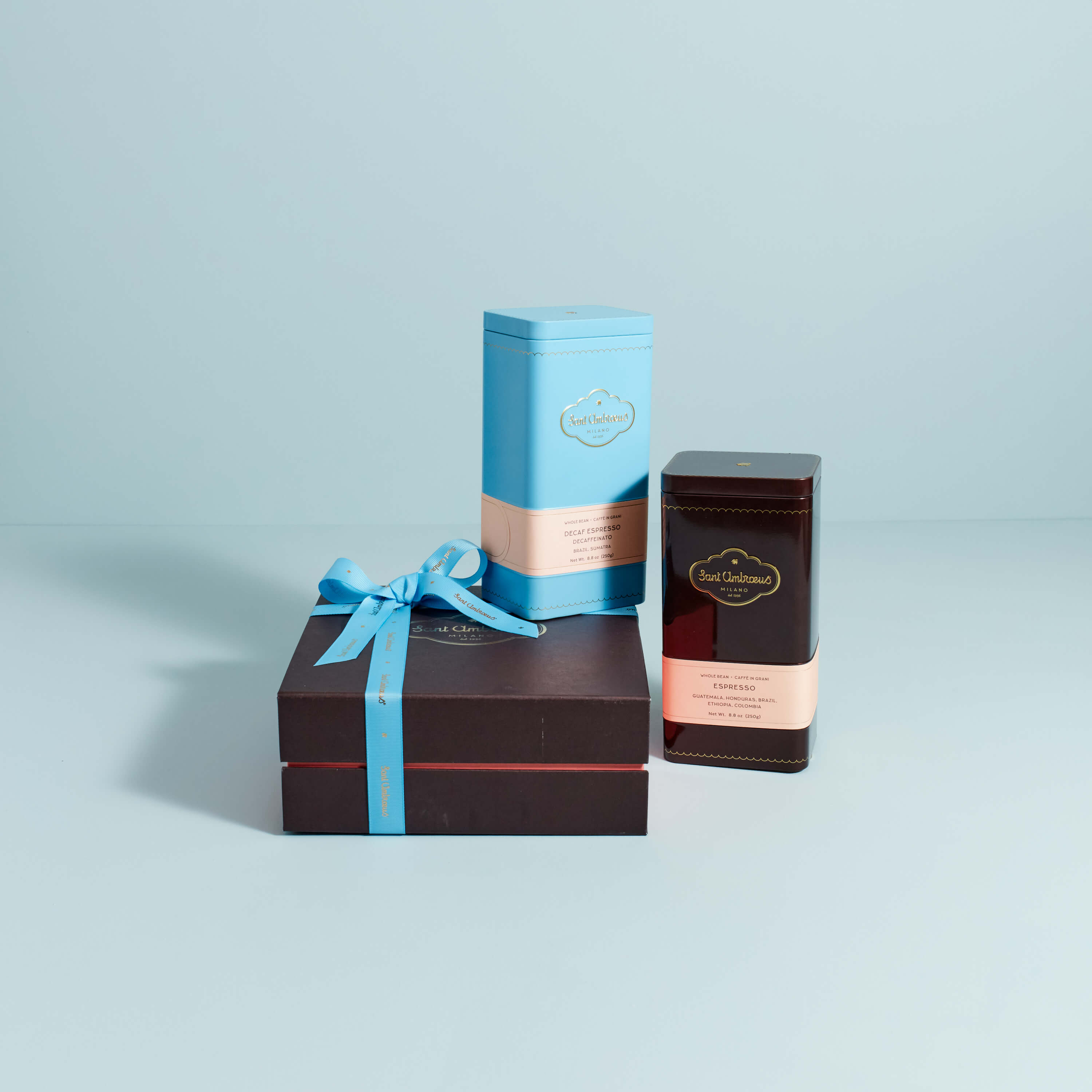 Raffinata confezione regalo contenente due latte di caffè: Espresso e Decaffeinato.