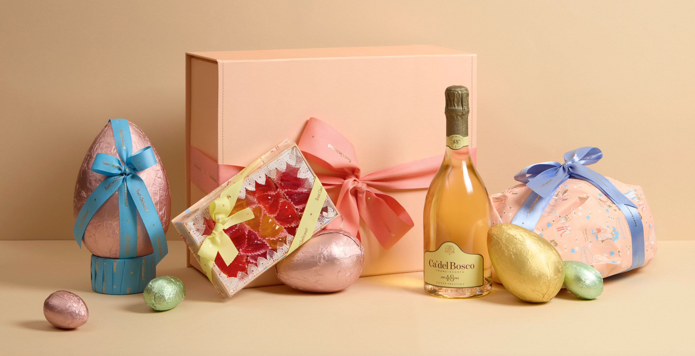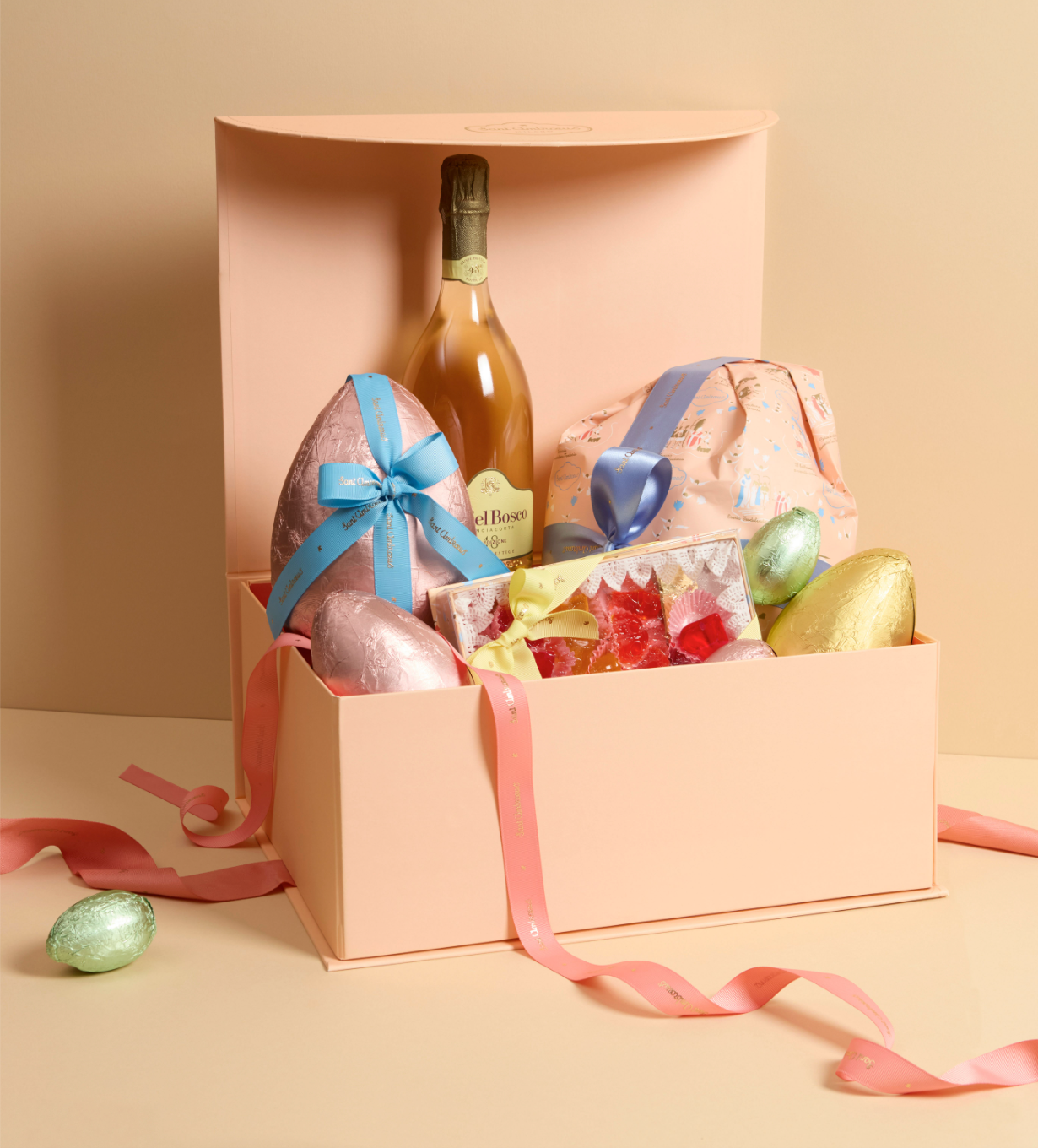 Include: colomba classica 1kg, 3 uova 25gr, 2 uova 50gr, uovo 300gr, scatola di gelatine piccola, scatola di ovetti piccola, bottiglia di Ca’ del Bosco.