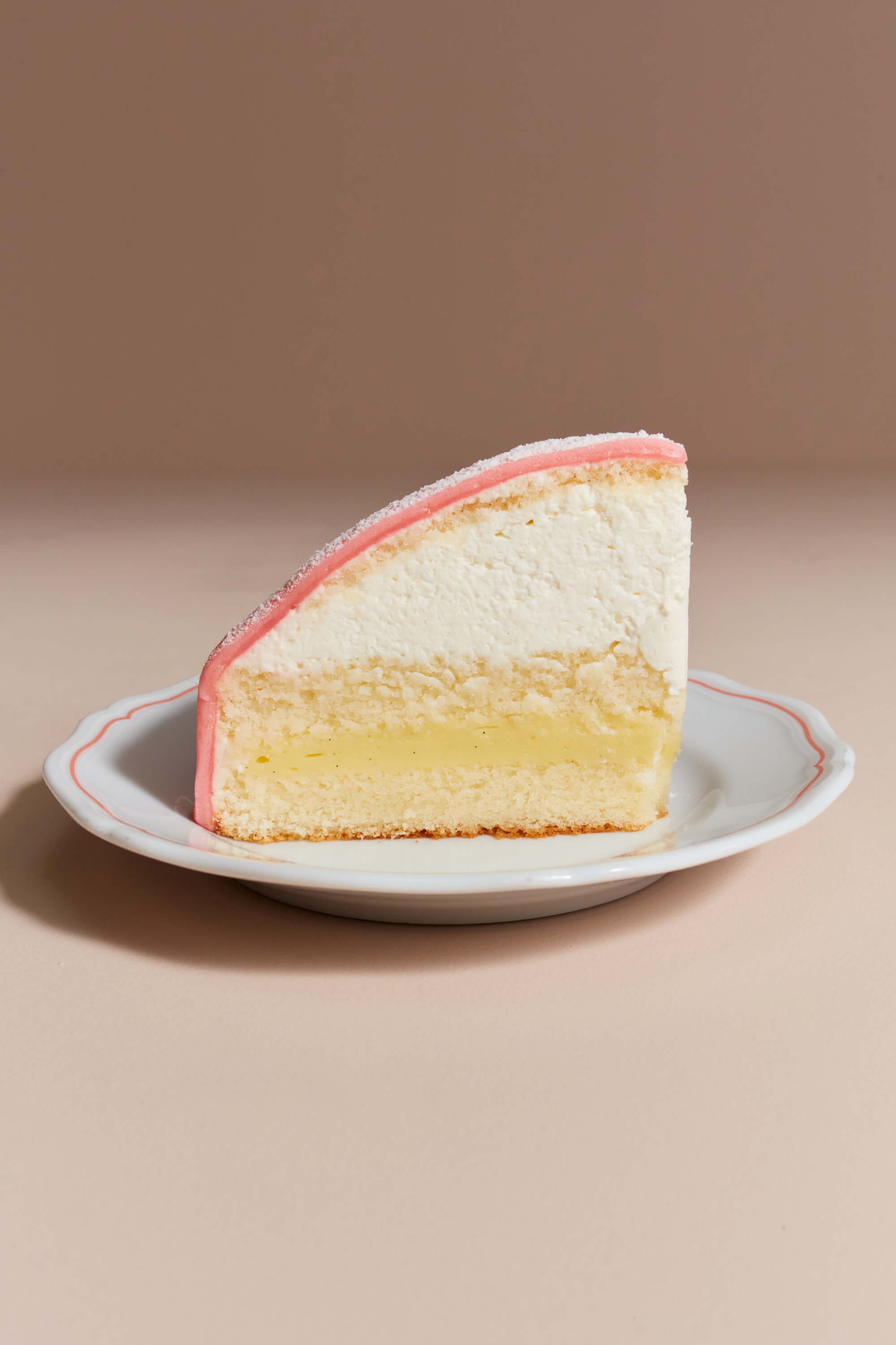 A bright lemon sponge cake layered between rich vanilla pastry cream and whipped cream, topped with pink almond marzipan.